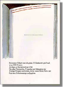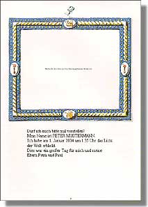 Seite 2 , Leseprobe: Darf ich mich bitte mal vorstellen? Mein Name ist PETER MUSTERMANN. Ich habe am l. Januar 2004 um 1:35 Uhr das Licht der Welt erblickt. Dies war ein großer Tag für mich und meine Eltern Petra und Paul. (Auf jeder Seite finden Sie reichlich Platz zum Einkleben der schönsten Bilder!) |