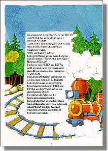 Seite 3, Leseprobe: Dann fährt die kleine Eisenbahn direkt auf ein Wäldchen zu. PETER und PETRA sind mucksmäuschenstill, als die Lokomotive ihre Wagen durch die Düsternis zieht. Große Bäume säumen die Strecke, ihre mächtigen Stämme sind zum Greifen nah. Holpernd überquert die Bimmelbahn einen Bach und verlässt schließlich den kleinen Wald. "Das war ganz schön unheimlich!", seufzt PETER erleichtert beim Aussteigen. |