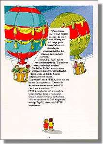 Seite 4, Leseprobe: "Was ist denn das?", fragt PETER erstaunt. Er deutet vom Gehweg aus auf einige große bunte Ballons mit Gondeln, die scheinbar frei über den Bäumen durch die Luft schweben. "Komm, PETRA!", ruft er unternehmungslustig. "Das müssen wir uns unbedingt ansehen!" Die beiden Kinder biegen in einen schmaleren Seitenweg ein und laufen zu der Stelle, an der die Ballons aufgestiegen sein müssen. "Sagenhaft!", jubelt PETER, als er nun des Rätsels Lösung erkennt. "Diese tolle Attraktion müssen wir auf jeden Fall gleich mal ausprobieren!" PETRA nickt aufgeregt, während die beiden die über ihnen schwebenden Gondeln voller Vorfreude beobachten. "Wir werden durch die Luft fliegen wie richtige Vögel!", stimmt sie PETER begeistert zu. |
