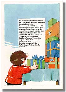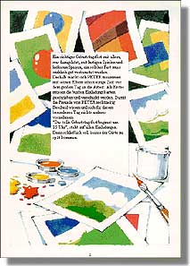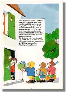 Seite 3, Leseprobe: Für jeden einzelnen Gast wird außerdem ein Tischkärtchen angefertigt, auf dem der Name des Kindes steht. Dann kommt für PETER und seine Eltern die schwierigste Aufgabe: Welche Spiele sollen bei dem Geburtstagsfest gespielt werden? Und was braucht man alles dazu? "Jeder meiner Freunde soll bei den Spielen etwas gewinnen", sagt PETER. "Deshalb müssen wir ganz viele Süßigkeiten besorgen. Und sie schön verpacken. Schließlich soll es eine Überraschung sein!" So werden nach und nach alle Vorbereitungen für den großen Tag getroffen. |