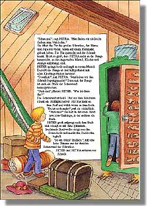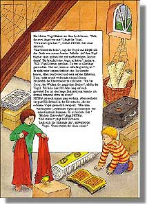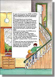 Seite 3, Leseprobe: "Schau mal", sagt PETRA. "Hier finden wir vielleicht Sachen zum Verkleiden." Sie öffnet die Tür des großen Schrankes, den Mama und Papa vor vielen Jahren auf einem Flohmarkt gekauft haben. Die Tür quietscht und der Schrank knarrt. Er ist so groß, dass PETRA nicht an die Stange heranreicht, an der eingestaubte Mäntel, Kleider und Anzüge aufgehängt sind. PETER springt hoch und zupft an einem Mantel. Da reißt die Stange ab und fällt polternd mit allen Kleidungsstücken herunter. "O verflixt!", ruft PETRA. "Jetzt haben wir den Schrank kaputtgemacht!" Denn mit der Stange ist auch ein Stück der Seitenwand herausgebrochen. "Guck mal", flüstert PETER. "Was ist denn das?" Die Seitenwand ist hohl. Und aus dem Hohlraum schaut ein Stoffzipfel hervor. PETRA zieht an dem Stoff und wühlt weiter in dem Loch. "Da ist noch mehr!", ruft sie schließlich. "Guck mal!" Sie hält in der einen Hand zwei rote Umhänge, in der anderen ein Buch. PETER greift aufgeregt nach dem Buch und schlägt es auf. Eine glitzernde, leuchtende Staubwolke steigt von den Seiten hoch und macht den Dachboden taghell. "So ein Glück! Endlich!", ruft eine hohe Stimme aus der dunklen Seitenwand des Schrankes. PETER und PETRA erstarren vor Schreck. |