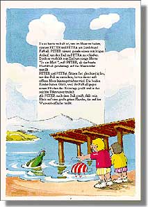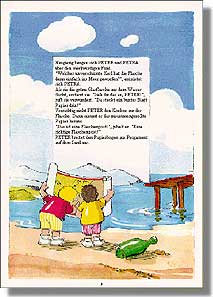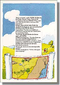 Seite 3, Leseprobe: Neugierig beugen sich PETER und PETRA über den merkwürdigen Fund. "Welcher unverschämte Kerl hat die Flasche denn einfach ins Meer geworfen?", entrüstet sich PETRA. Als sie die grüne Glasflasche aus dem Wasser fischt, erstarrt sie. "Sieh dir das an, PETER!", ruft sie verwundert. "Da steckt ein buntes Blatt Papier drin!" Vorsichtig zieht PETER den Korken aus der Flasche. Dann nimmt er das zusammengerollte Papier heraus. "Das ist eine Flaschenpost!", jubelt er. "Eine richtige Flaschenpost!" PETER breitet den Papierbogen aus Pergament auf dem Sand aus. |