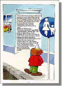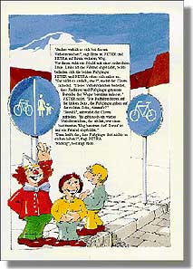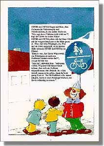 Seite 4, Leseprobe: "Anders verhält es sich bei diesem Verkehrszeichen", sagt Enzo zu PETER und PETRA auf ihrem weiteren Weg. Vor ihnen steht ein Schild mit einer senkrechten Linie. Links ist das Fahrrad abgebildet, rechts befinden sich die beiden Fußgänger. PETER und PETRA sehen sich ratlos an. "Gar nicht so einfach, was?", meint der Clown lächelnd. "Dieses Verkehrszeichen bedeutet, dass Radfahrer und Fußgänger getrennte Bereiche des Weges benutzen müssen." PETER nickt. "Die Radfahrer fahren auf der linken Seite, die Fußgänger gehen auf der rechten Seite, stimmt's?" "Jawohl", antwortet der Clown zufrieden. "Es gibt noch ein viertes Verkehrszeichen, das erklärt, wer einen bestimmten Weg benutzen darf. Darauf ist nur ein Fahrrad abgebildet." "Dann heißt das, dass Fußgänger dort nichts zu suchen haben?", fragt PETRA. "Richtig", bestätigt Enzo. |