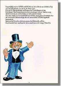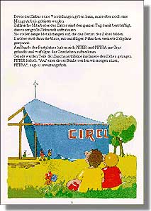 Seite 4, Leseprobe: Ungeduldig warten PETER und PETRA mit ihren Eltern am nächsten Tag vor der Zirkuskasse, bis sie an der Reihe sind. Das große Zirkuszelt liegt vor Beginn der Vorstellung noch im Halbdunkel. Ein Platzanweiser in einer prächtigen blauen Uniform zeigt den Besuchern, in welche Reihe sie sich setzen können. Von ihrer Bank aus haben PETER und PETRA einen guten Überblick über die kreisrunde Zirkusmanege, die mit einer dicken Schicht Sägemehl bestreut ist. Immer mehr Besucher strömen nun in das Zirkuszelt, auf der Zuschauertribüne rund um die Arena sind nur noch wenige Plätze frei. |